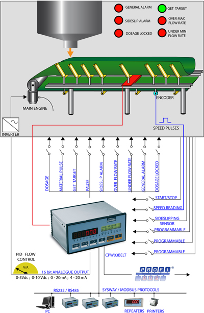 * Régulateur de capacité horaire de dosage, avec réglage de vitesse du convoyeur ou du flux de matériaux par sortie analogique programmable. Algorithme de réglage PID (proportionnel, intégral, dérivé) complètement réglable.