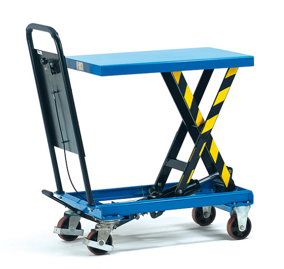ce chariot à plate-forme élévatrice est muni de 2 roues fixes et 2 roues pivotantes à bandage caoutchouc dur avec freins, moyeu à roulement à billes avec un dossier de poussée fixe boulonné et une pompe hydraulique à pédale.