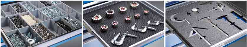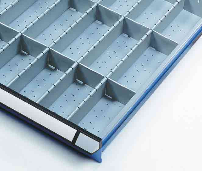 Large variété d'exécution et modularité grâce aux kits préconfigurés et aux pièces détachées librement combinables, tels que parois à fentes, plaquettes séparatrices, bacs en plastique, godets, etc.