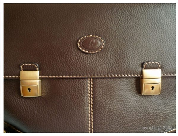 Serviette en cuir de vachette souple grainé, de coloris brun, surpiqué beige clair, fermée par un rabat muni de deux serrures à clé, présentant une grande poche à l'avant et à l'arrière, une poche plate zippée.