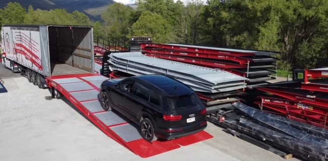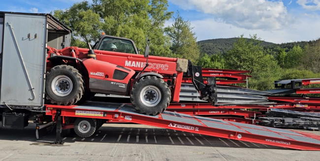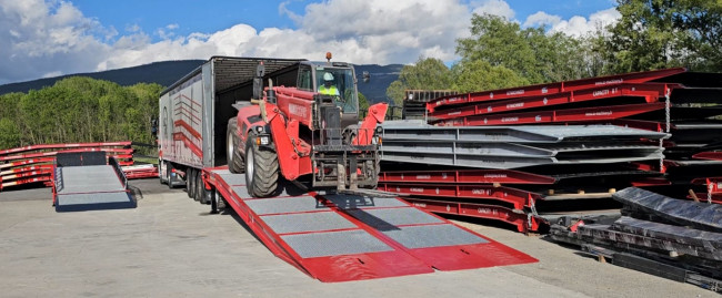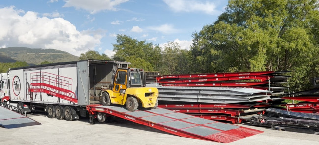 Applications: Idéal pour le chargement de matériels agricoles, véhicules militaires, véhicules blindés, engins de combat, l'utilisation en casse, déchetterie, chantiers nécessitant le chargement / déchargement d'engins volumineux, machines larges. Désaccouplable en deux parties identiques mobiles et indépendantes, celle-ci vous permettra de décharger toutes types de machines quelque soit sa largeur. Sa Plate-forme d’accès pleine vous permettra un accès facilité avec tous types de matériels de manutention et de BTP. Les deux parties de cette rampe sont utilisables indépendamment l'une de l'autre, ou ensemble.