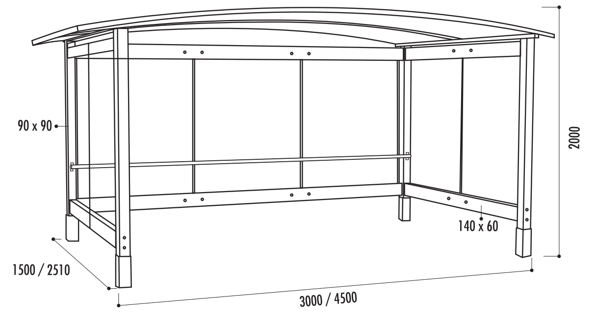 - Toit : couverture arrondie 2 faces en polycarbonate alvéolaire traité anti-UV, pincées entre les arceaux