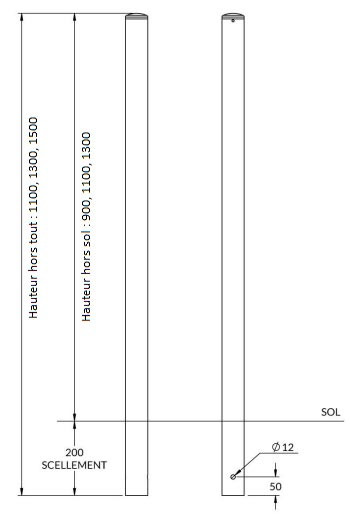 Disponible en trois diamètres : Ø 60 mm, Ø 76 mm et Ø 102 mm, et quatre hauteurs hors sol : 900 mm, 1000 mm, 1200 mm ou 1300 mm.