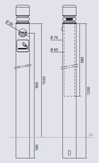 | Réf. TC :148883223 | Potelet cendrier en acier | 1500 mégots environ | 1200 | Ø 76 | Ø 60 | 9 | -