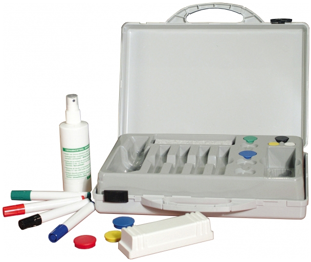 Cet accessoire pour tableau est composé d’une mallette contenant 4 marqueurs, une brosse d’effaçage magnétique, 10 recharges en feutre pour brosse, une bombe de nettoyage et 6 aimants.