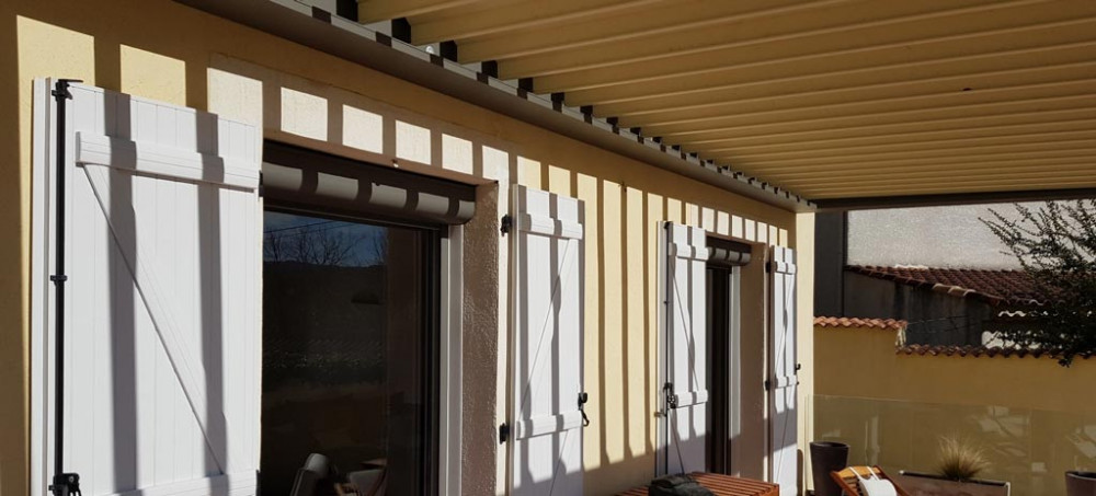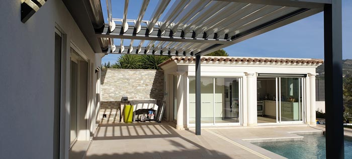 pergola bioclimatique orientable motorisée sur mesure permet d’aménager un espace extérieur en apportant une protection contre le soleil et les intempéries.