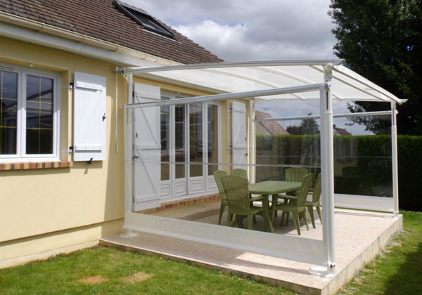 une solution avec store pour couvrir une terrasse de 8 X 5 m. possibilité d"ancrage de poteaux d"arrimage (protection contre vent)