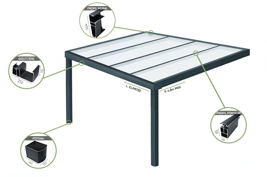 - Profil gouttière : Hauteur 115mm x Profondeur de 212mm