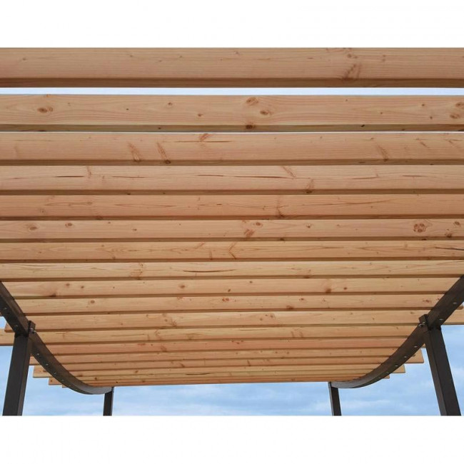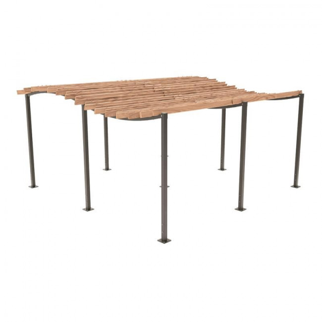 Elégante grâce à son allure de vague, cette pergola trouvera facilement sa place dans l’environnement.