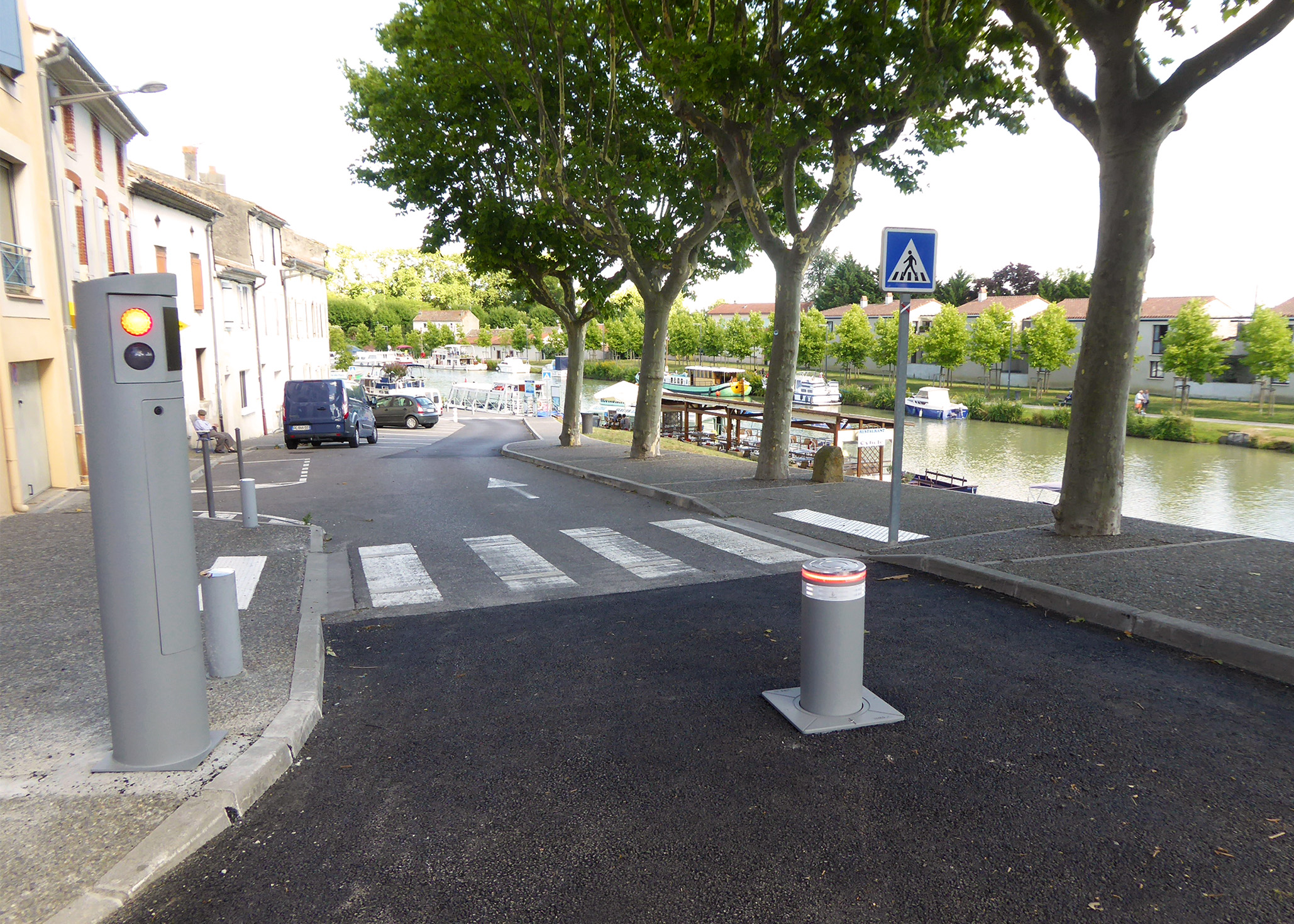 Bornes escamotables pour réguler l"accès à un passage piétons de 3,4 mètre de large.