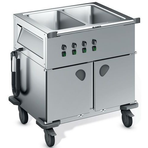 Optez pour notre chariot bain marie chaud 2 cuves, en acier inoxydable, conçu pour la restauration collective et les services traiteurs exigeants.