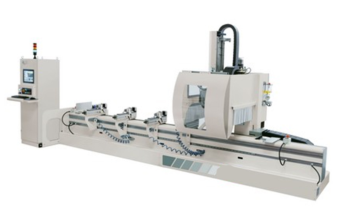 Centre de fraisage vertical, à montant mobile, avec 3 axes contrôlés par CNC, pour l’usinage de pièces en aluminium, alliages légers, PVC et acier.