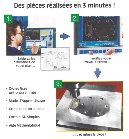 Cette machine est équipée du système CNC CENTROID 3-4 axes « conversationnel » avec une programmation très simple et directe permettant de réaliser des pièces basiques et sophistiquées avec des temps de fabrication extrêmement courts.
