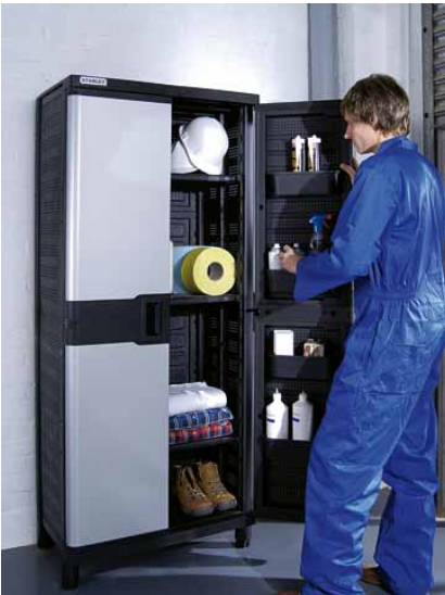 Armoire à haute résistance d’une grande capacité de stockage avec des côtés et porte intérieures pré-perforés pour accrochage facile des outils, un montage vite et facile, des renforts métalliques et des pieds réglables pour plus de stabilité.