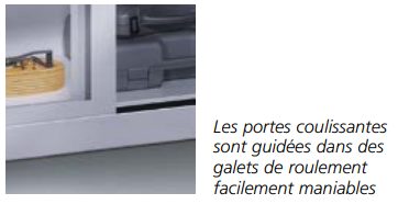 Le système de portes coulissantes repose sur des galets de roulement montés sur rails de guidage spécifiques, assurant une ouverture fluide et durable, même en cas d’utilisation intensive.