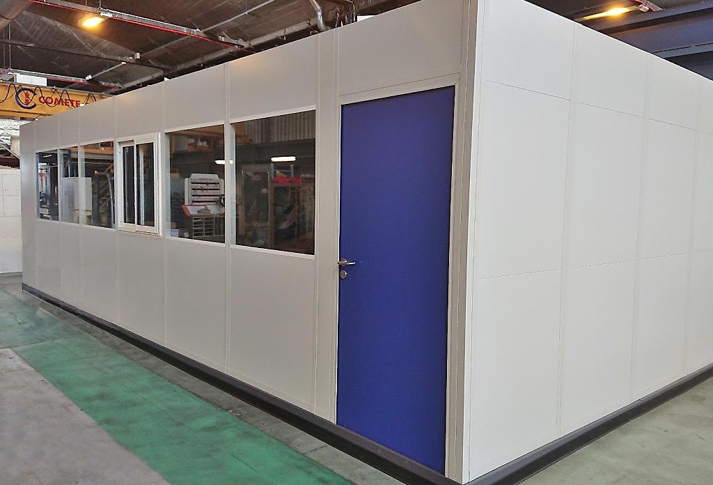 la réalisation d"une salle de contrôle dim. larg.3000mm x long.5000mm x haut.2200mm posée à même le sol dans un atelier de tôlerie existant.