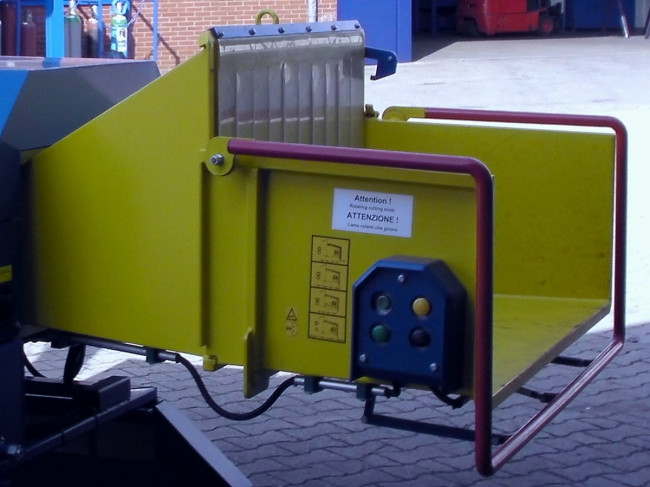 Dimensions de la trémie d’alimentation: largeur 1380 mm et hauteur 730 mm. L’ouverture maximale aux rouleaux ameneurs est de 355×255 mm. Un bras d’arrêt d’urgence est placé devant la trémie d’alimentation.