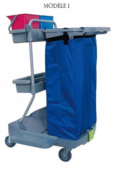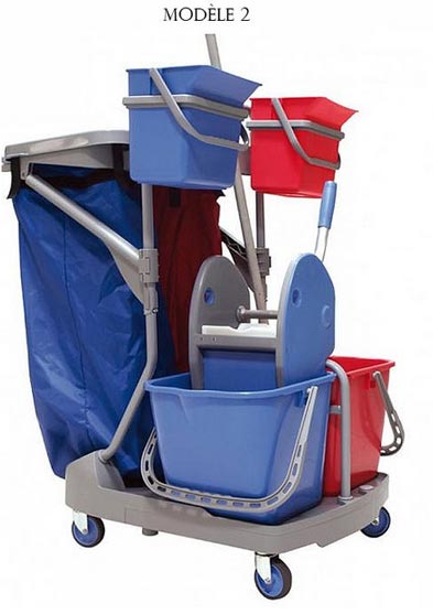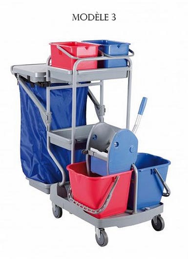 C'est un chariot de ménage muni de roues en métal pour déplacer les produits de nettoyage partout et en toute fluidité.