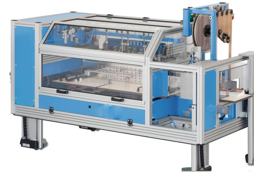 Réalisez automatiquement des piles de produits de diversformatsdivers tout en respectant les marges en optant pour la banderoleuse plieuse-lieuse.