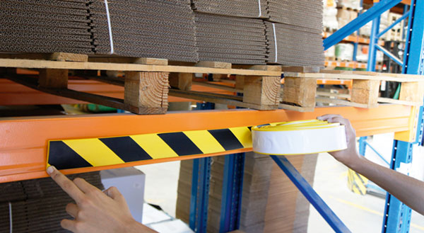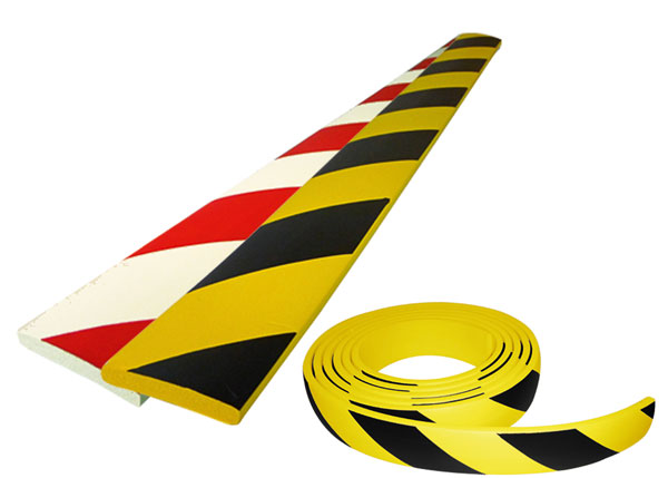 bandes jaunes ou rouges, elle protége efficacement les bordures de stockeurs à palettes.