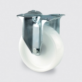 action (roue et pivot), roue en polyamide blanc, Moyeu lisse, axe boulonné