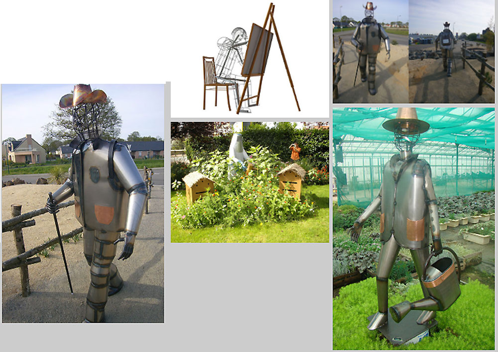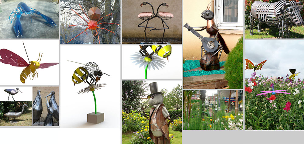 - Répond à de nombreux thèmes de décoration extérieures et s’est spécialisé dans la réalisation de personnages : jardiniers avec différents outils, randonneurs, jardinières, pêcheurs, apiculteurs, mineurs, criquets à forme humaine jouant de tous les instruments de musique mais également de formes animalières passant de la cigogne au scarabée doré dans des formats XXL qui correspondent à vos jardins extérieurs.