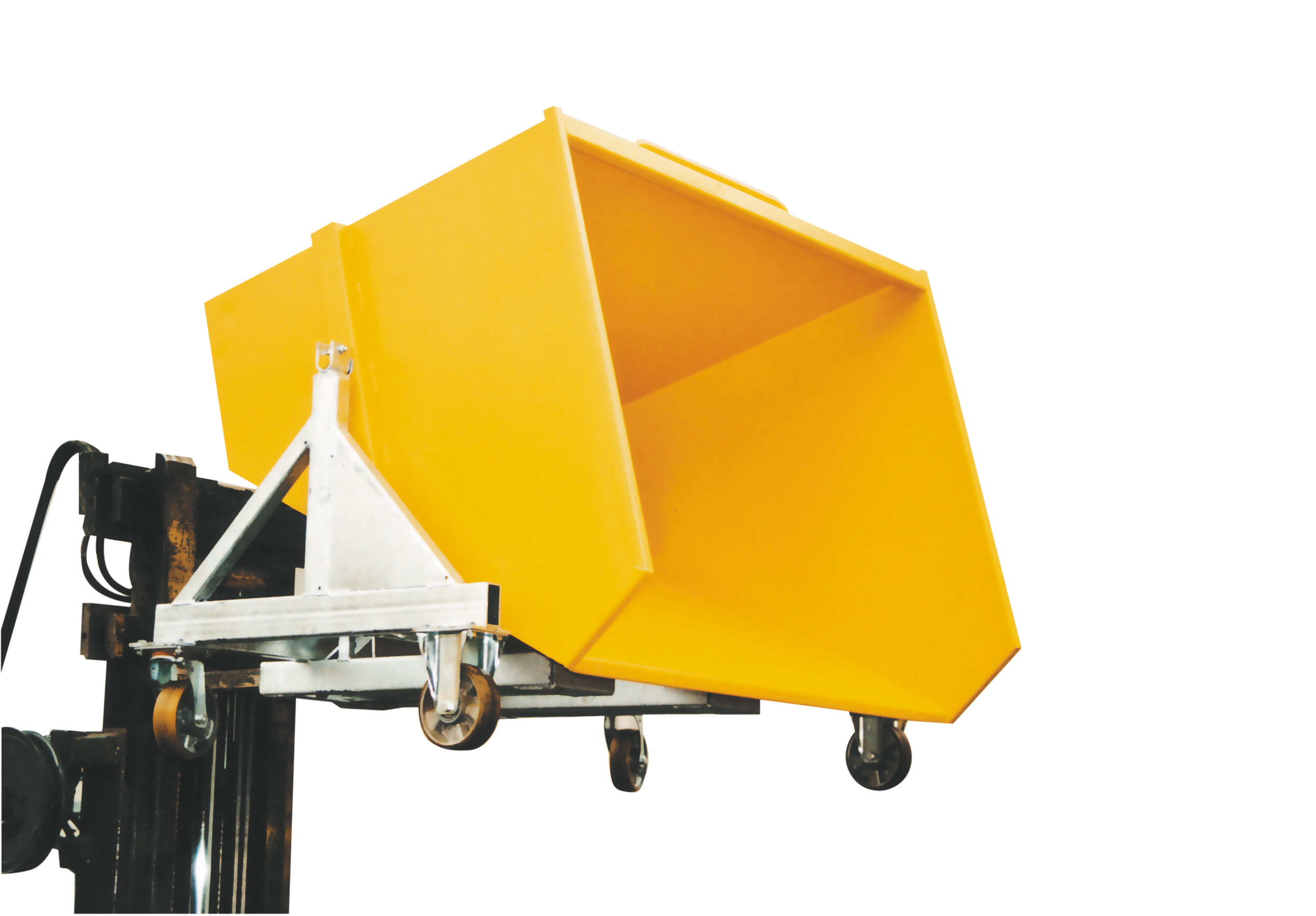L’ouverture du fond se fait par un levier à commande manuelle, permettant à l’opérateur de contrôler le vidage en toute sécurité sans descendre du chariot élévateur.