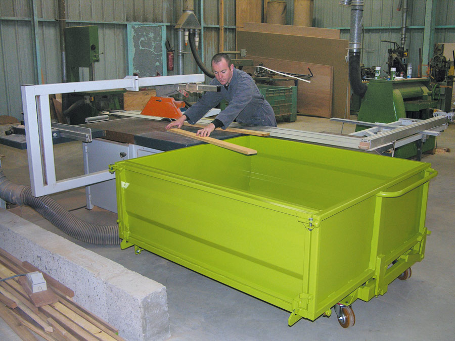 Cette benne possède une hauteur réduite spécialement adaptée aux tables de scie.