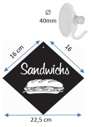 Pancarte Sandwich en PVC expansé 3mm noir avec ventouse Ø 40 mm à crochet pour fixation.