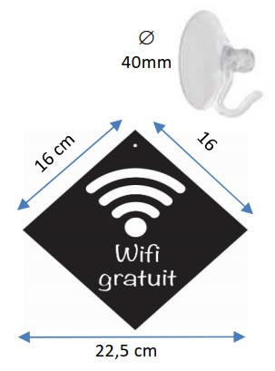 Pancarte Wifi gratuit en PVC expansé 3mm noir avec ventouse Ø 40 mm à crochet pour fixation.