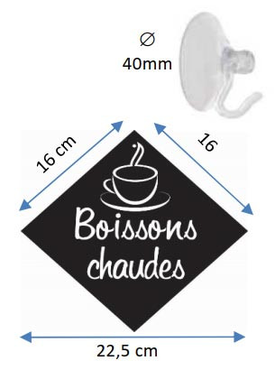 Pancarte Boissons chaudes en PVC expansé 3mm noir avec ventouse Ø 40 mm à crochet pour fixation.