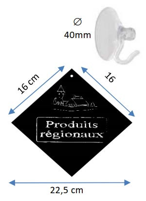 Pancarte Produits régionaux en PVC expansé 3mm noir avec ventouse Ø 40 mm à crochet pour fixation.
