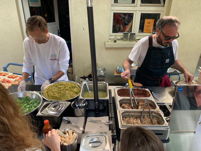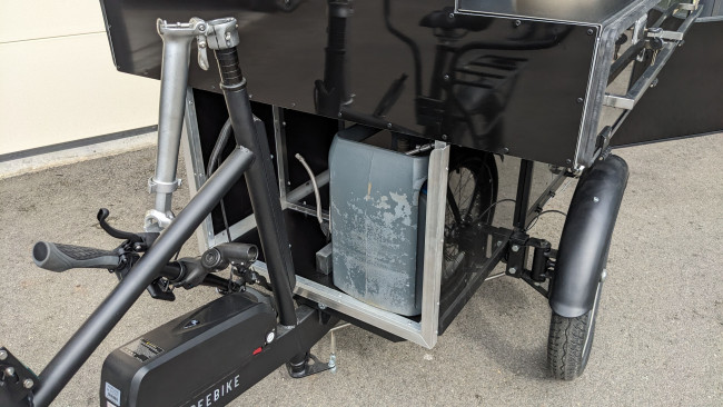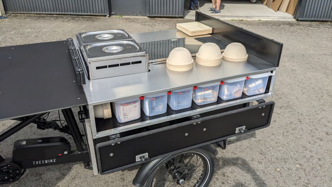 Faible empreinte environnementale : L'ensemble du projet a été conçu avec l'idée de réduite au maximum l'empreinte carbone, moteur électrique donc sans émissions de CO², module cuisine fabriqué en France et triporteur fabriqué au Portugal.
