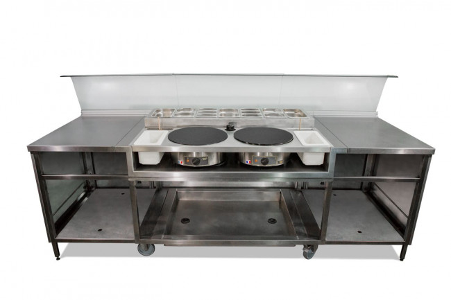 MOBILCOOK constitue un ensemble complet, composé d’un module de base librement complété par des équipements de préparation, de cuisson, de maintien en température, d’hygiène et par des accessoires spécifiques aux différents types de cuisine.