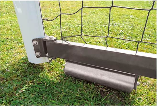 Les buts de football repliables sont équipés d’un axe de pivotement dans les fourreaux et de rouleaux de déplacement en acier électrozingué de 300 mm de longueur.