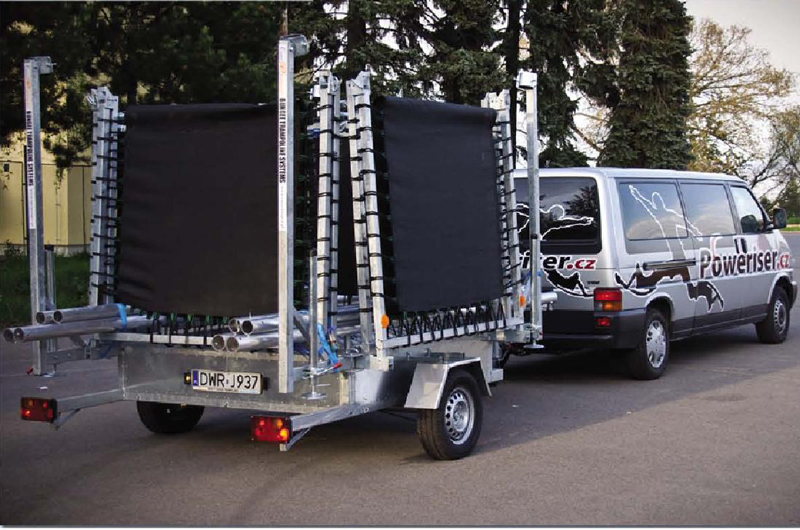 La particularité de ce modèle tient au fait que ses 4 trampolines rectangulaires repliables, sont fixés à demeure sur la base de la remorque, facilitant ainsi la manutention du bungee.