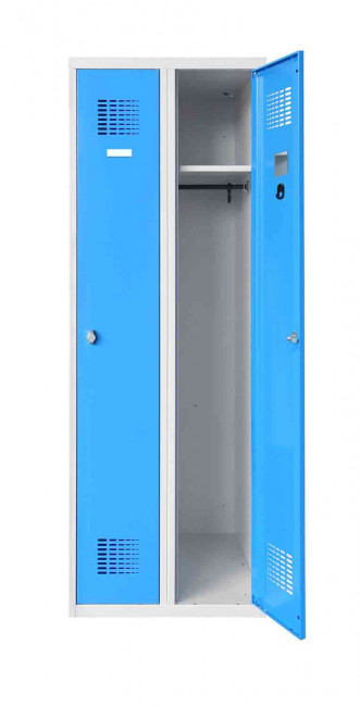 Ce vestiaire est équipé d’une tablette supérieure soudée et d’une tringle en PVC munie de 2 crochets.