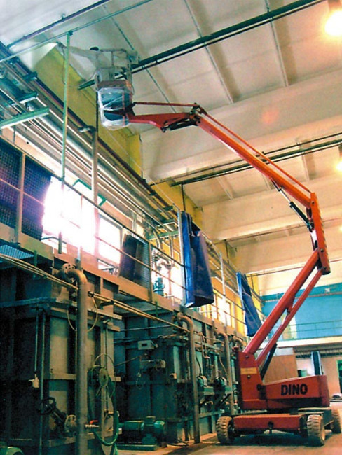 Nous réalisons presque la totalité de nos travaux à partir de nos plateformes de travail spéciales. Grâce à ces dernières, nous atteignons même les endroits exigus. Nous peignons entre les machines, étagères, matériaux et produits. À chaque fois, nous couvrons tout sur le lieu du travail par des grandes toiles. À la fin de chaque poste, nous réalisons un nettoyage.