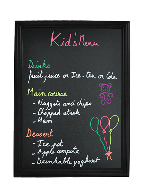 Facile à installer grâce aux crochets muraux inclus, elle s’utilise quotidiennement avec de la craie ou des feutres craie liquide effaçables.