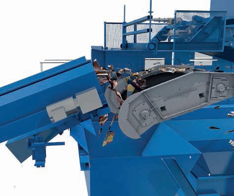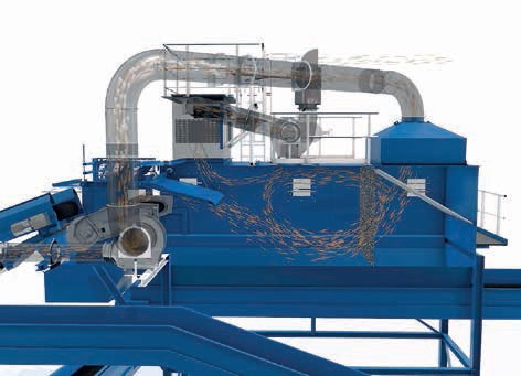 Le matériau préconditionné est réparti de manière homogène sur le tapis d’accélération, puis il passe sous une buse qui propulse les particules légères dans la chambre de décantation.