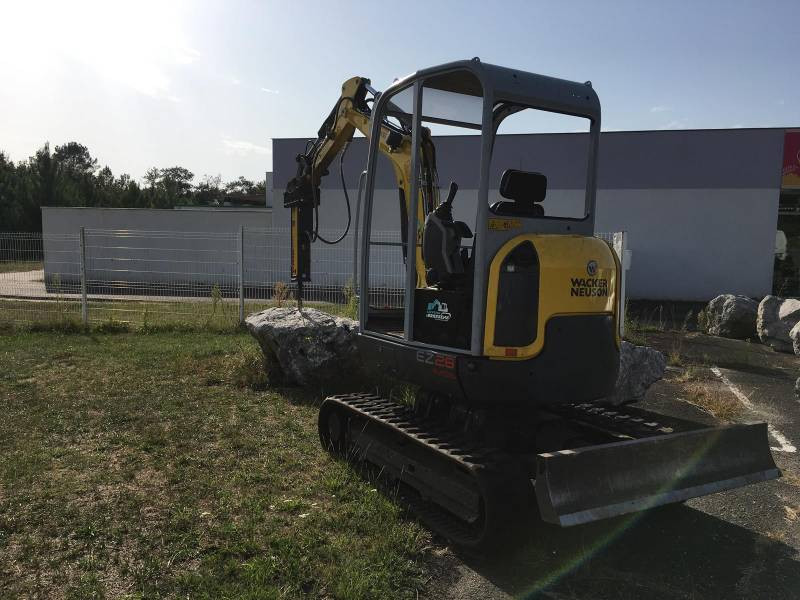 Le BRH est connecté à l'extrémité du bras articulé d'une mini-pelle de 2.6 tonnes et a une puissante force de frappe.