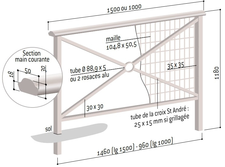 * Main courante : 1/2 rond plein 40 x 10 sur tube acier 30 x 30 ;