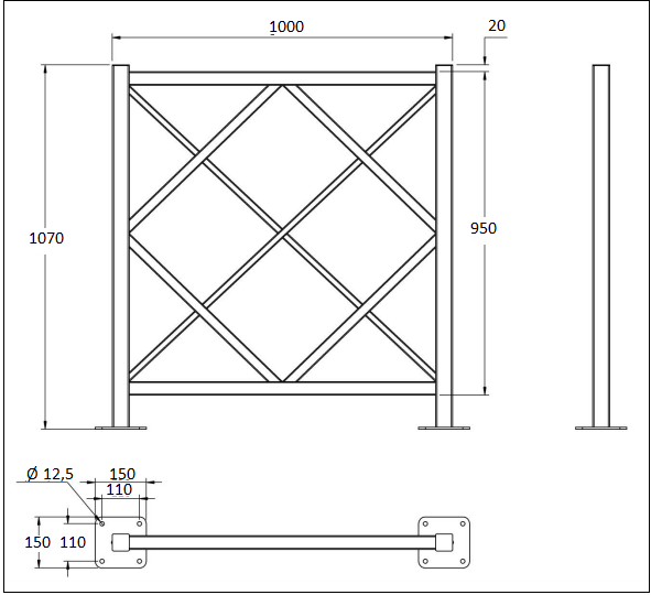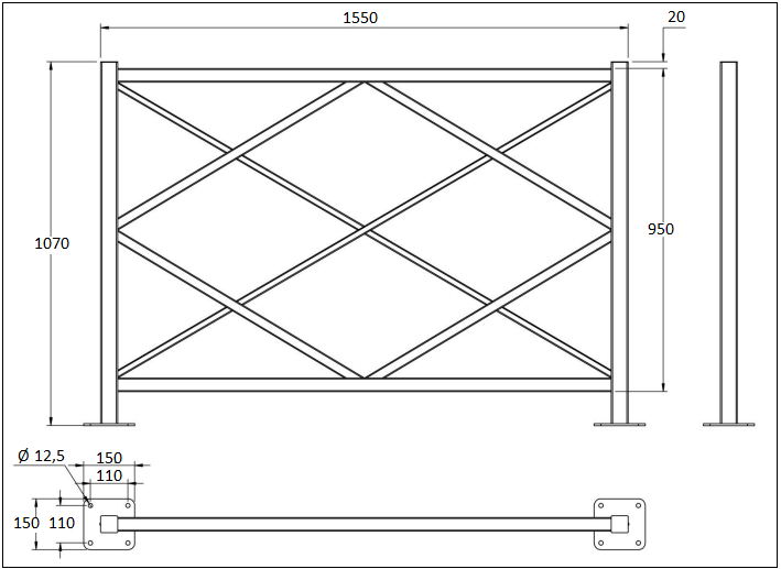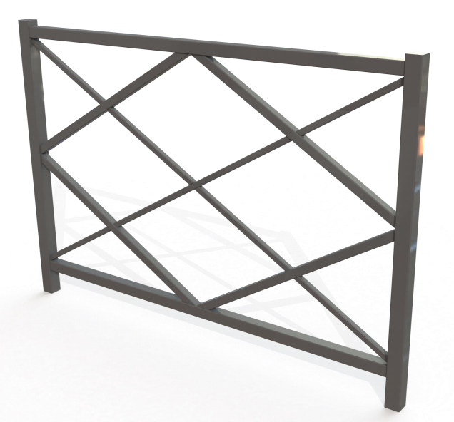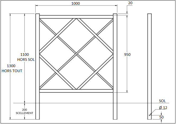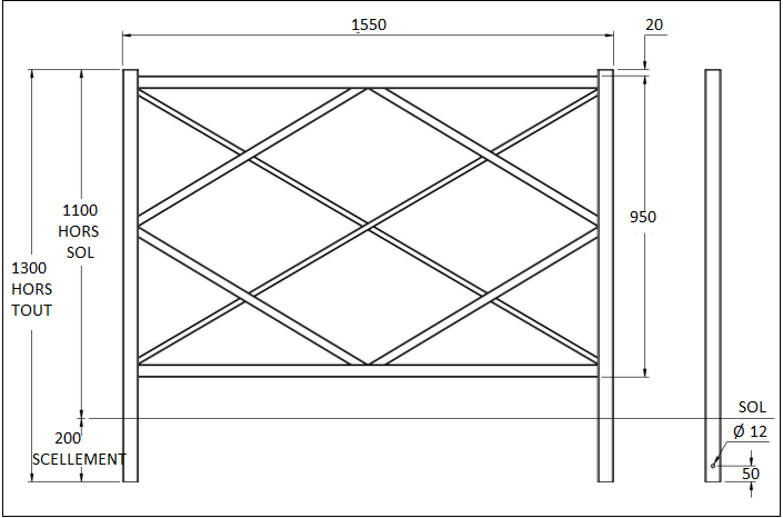 Sa structure est constituée de montants en tube d’acier de 50 x 50 mm, de lisses de 40 x 40 mm, ainsi que de croix de 20 x 20 mm, assurant robustesse et stabilité. Le motif losange, réalisé en tube d’acier de 30 x 30 mm.