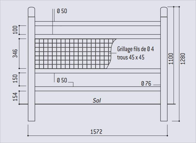 La hauteur hors tout de 1 280 mm intègre l’ensemble des éléments, du grillage au pommeau, pour une finition homogène.