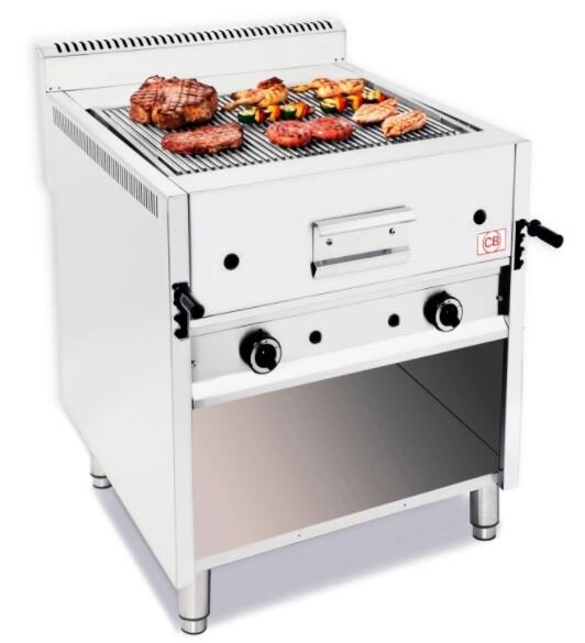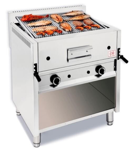 Grill à pierre de lave professionnel avec meuble ouvert, avec grille universelle incluse et avec possibilité de la remplacer par d'autres type de grilles.
