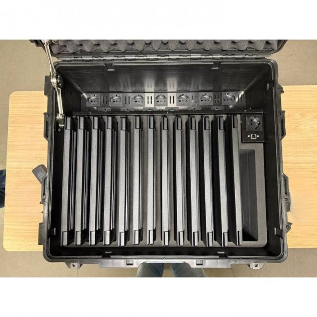 La valise offre 14 prises électriques pour recharger 13 ordinateurs en même temps, avec une prise dédiée pour la valise elle-même et un interrupteur pour activer la charge.
