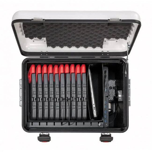 Grâce aux HUBS USB intelligents à double connectique USB-A et USB-C, notre solution permet la recharge simultanée des tablettes iPad, sans réglage manuel. La gestion automatique de la puissance adapte la charge à chaque appareil. La sécurité est intégrée au fonctionnement : recharge possible valise fermée grâce à l’alimentation centralisée, capteur de température avec arrêt automatique en cas de surchauffe et ventilation optimisée par des ouvertures dans le couvercle et le fond de la valise.