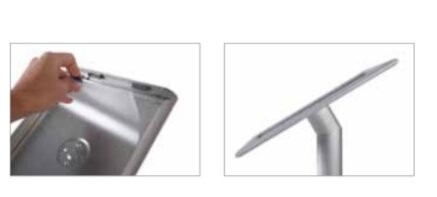 Ce pupitre menu incliné en aluminium est un support de communication visuelle qui sert à présenter les cartes, menus et catalogues à l’intérieure.