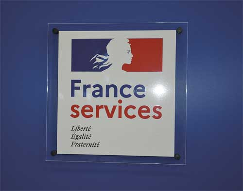 Il est possible de personnaliser le panneau grâce à l'adhésif de couleur (fichier à nous fournir) comme ici pour France Services.