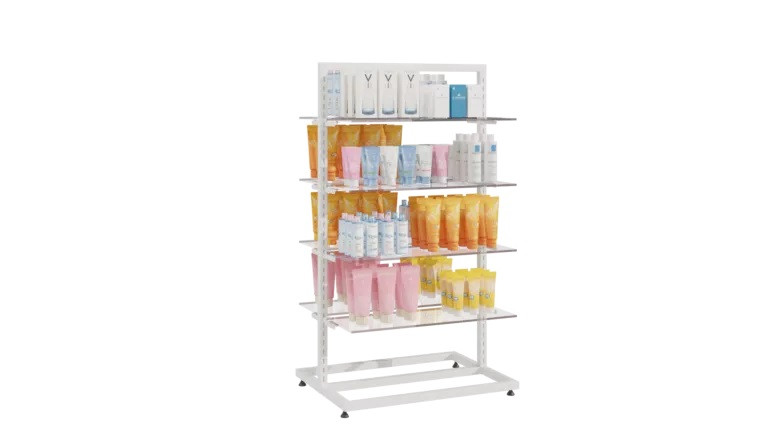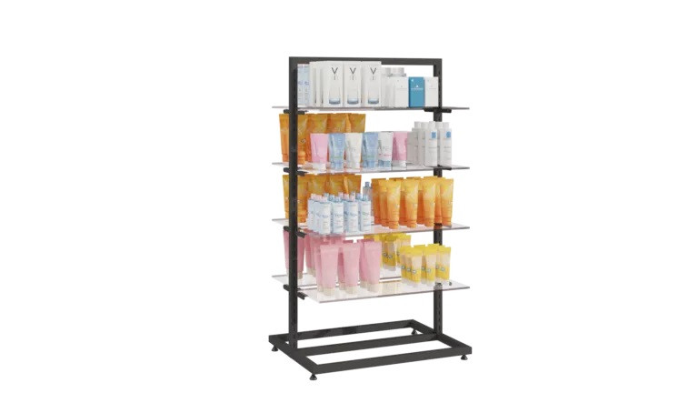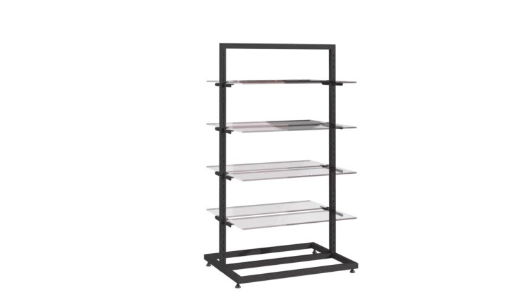 Cette gondole de magasin sur roulettes offre flexibilité et élégance grâce à ses tablettes en verre.